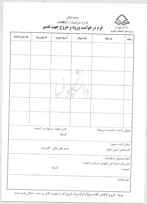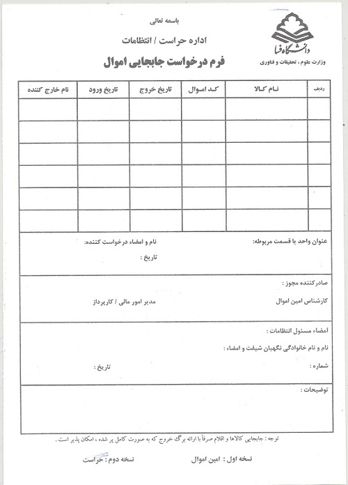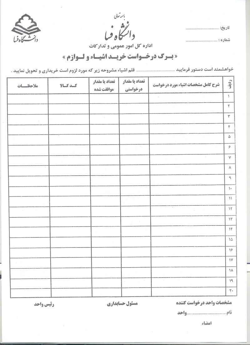 فرم های امور مالی تعداد بازدید:۱۲۳۱ ارسال به دیگران نام شما ایمیل شما ایمیل دریافتکننده ارسال انصراف جهت مشاهده فرم ورود و خروج کالا کلیک نمائید. جهت مشاهده فرم جابجایی اموال کلیک نمائید. جهت مشاهده فرم در خواست تعهد حقوقی کلیک نمایید. جهت مشاهده برگ حساب امور مالی کلیک نمایید. جهت مشاهده فرم درخواست خرید کلیک نمایید.